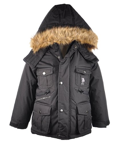U.S. Polo Assn., This U.S. Polo Assn. jacket combines a classic look with all the warmth he'll need for winter. The weather-resistant shell has full insulation. Jacket features a snap and zipper placket, Velcro cuffs, 4 snap pockets, and 2 sealed zipper pockets. The hood has removable faux fur trim and a Velcro closure. Subtle logo embroidery throughout the chest completes the look. Shell/Lining/Filler: 100% Polyester Hood Trim: 75% Acrylic, 25% Polyester Machine Wash Cold Made in China
